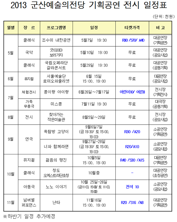 | 1 | 2013 군산예술의전당 기획공연·전시 일정표 |