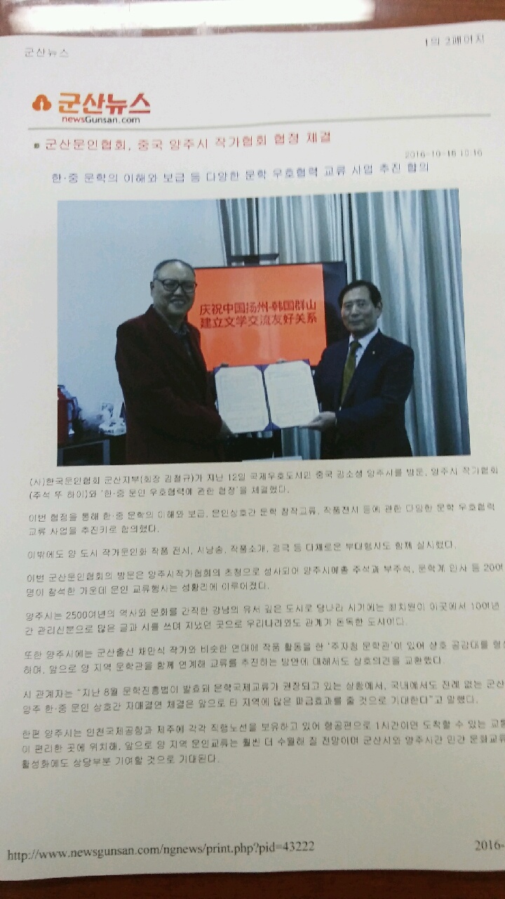 군산문인협회 중국양주시작가협회와 자매결연 체결