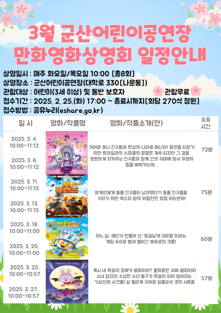 101 2025년 3월 군산어린이공연장 만화영화상영회 다운받기 예술의전당관리과 25.02.24 558