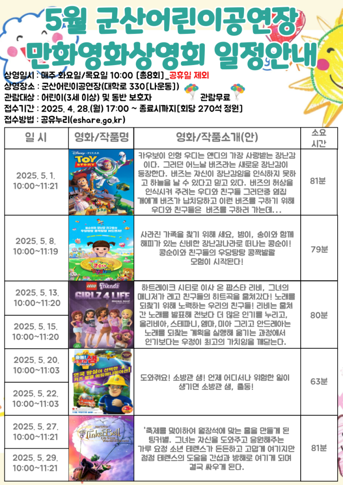 107 2025년 5월 군산어린이공연장 어린이 만화영화 상영 안내 다운받기 예술의전당관리과 25.04.25 540