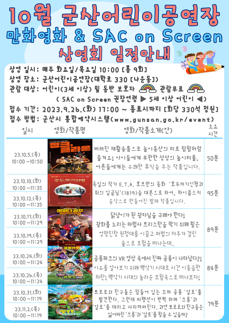 64 2023년 10월 어린이공연장 만화영화 & SAC on Screen 상영안내 다운받기 예술의전당관리과 23.09.26 924