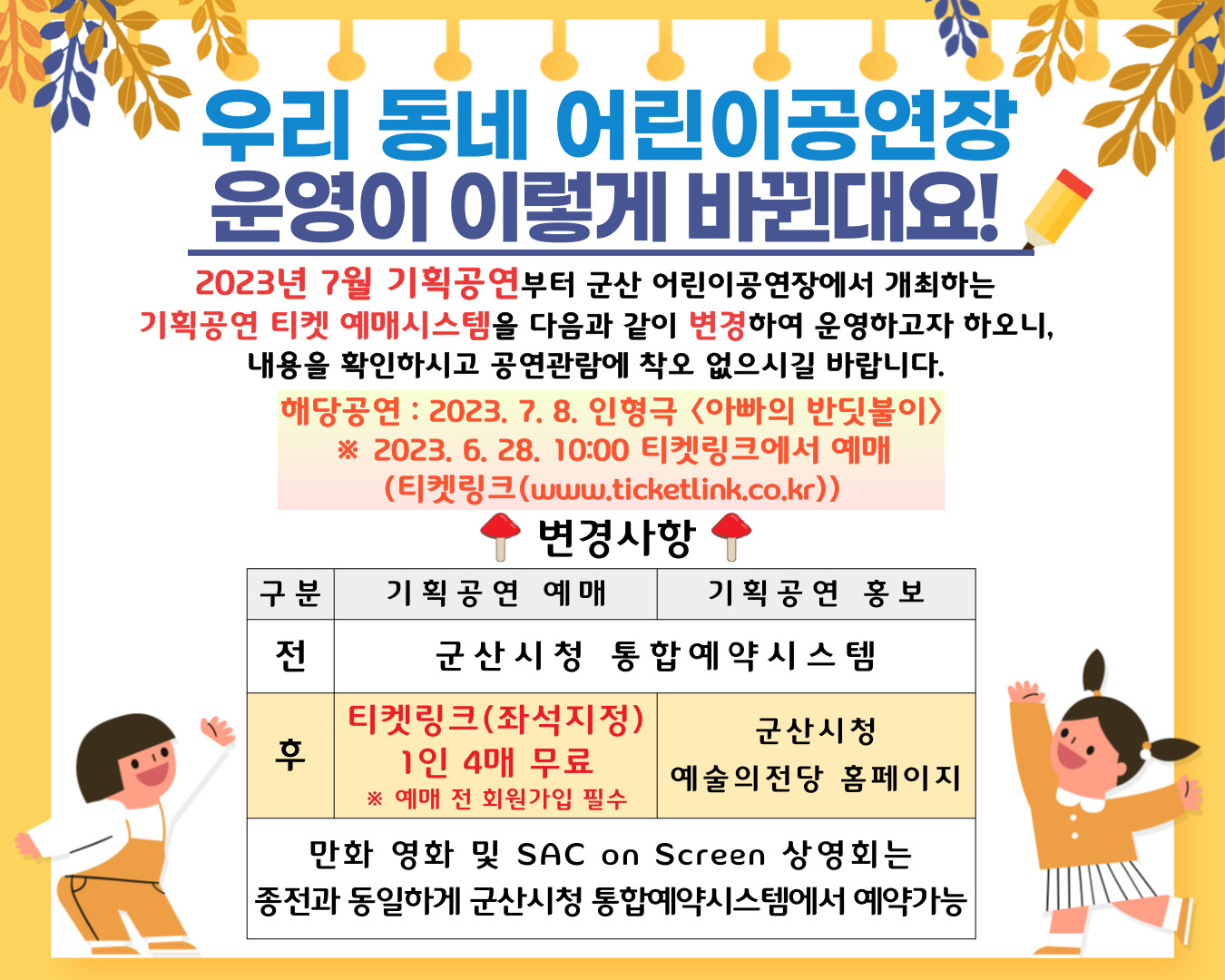 이에, 2023. 7. 1.부터 군산 어린이공연장에서 개최하는 기획공연 및 만화 영화 상영을 다음과 같이 변경하여 운영하고자 하오니,