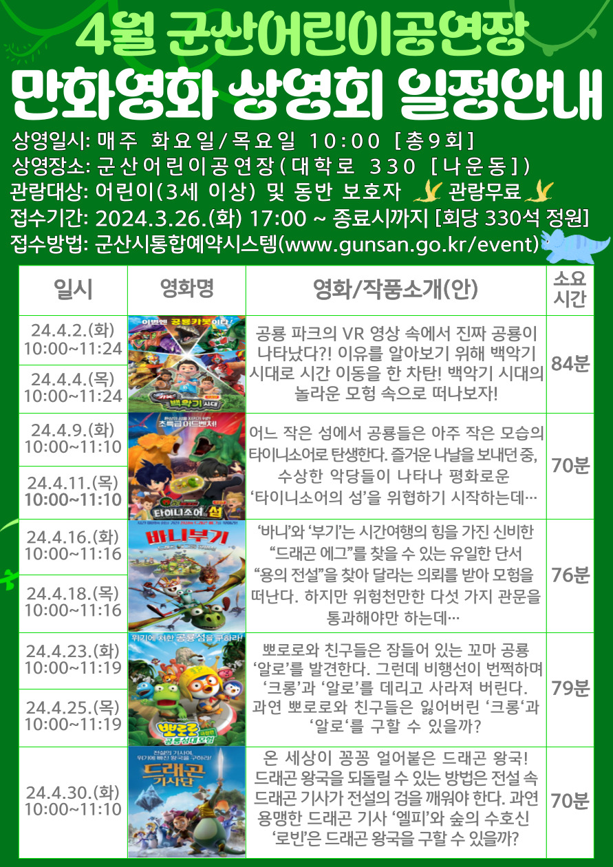 2024년 4월 군산어린이공연장 만화영화 상영회 일정 안내