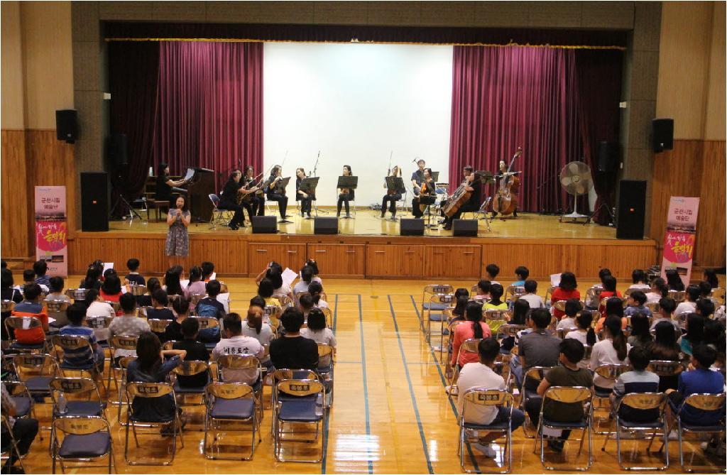 또한 아이들에게 바이올린, 비올라, 첼로, 더블베이스의 음색의 차이를 느껴볼 수 있는 연주와 설명으로 음악적 지식을 얻을 수 있었으며 아이들이 좋아하는 노래와 무대 구성으로 클래식에 흥미를 갖을 수 있는 시간이었습니다.