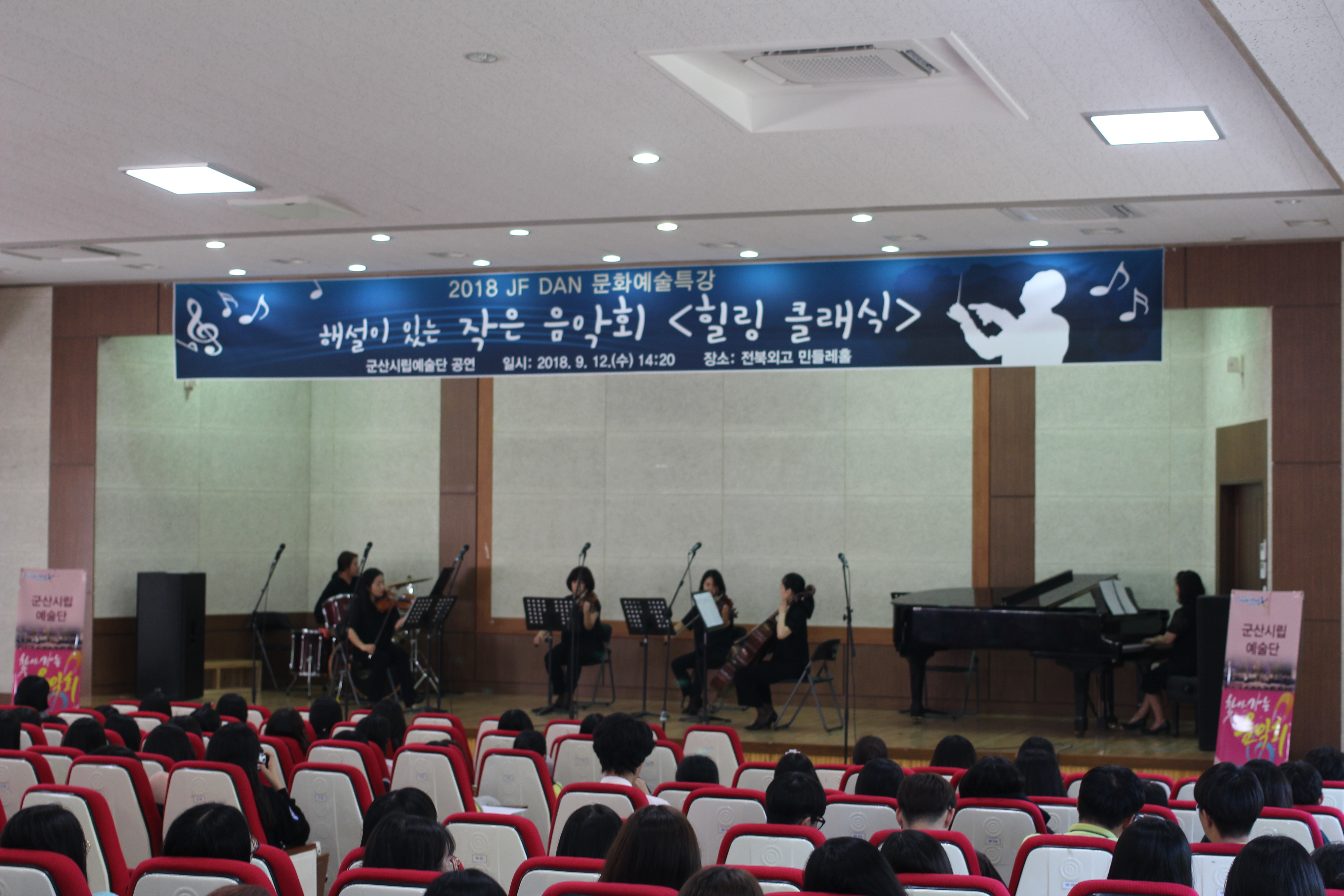 전북외고의 '해설이 있는 작음 음악회 <힐링 클래식>' 에서  공연하는 군산시립예술단의 사진 올립니다. 군산시립예술단의 <찾아가는 작은 음악회> 일환으로 열린 이번 공연은 다양한 현악, 관악, 합창곡에 쉽고 재미있는 해설을 곁들여 학생들의 호응이 컸습니다. 음향 시설이 미흡한 실내 공연임에도 훌륭한 연주와 합창으로 아름다운 가을 오후를 선물해 주신 군산시립예술단 여러분께 진심으로 감사의 말씀 전합니다!