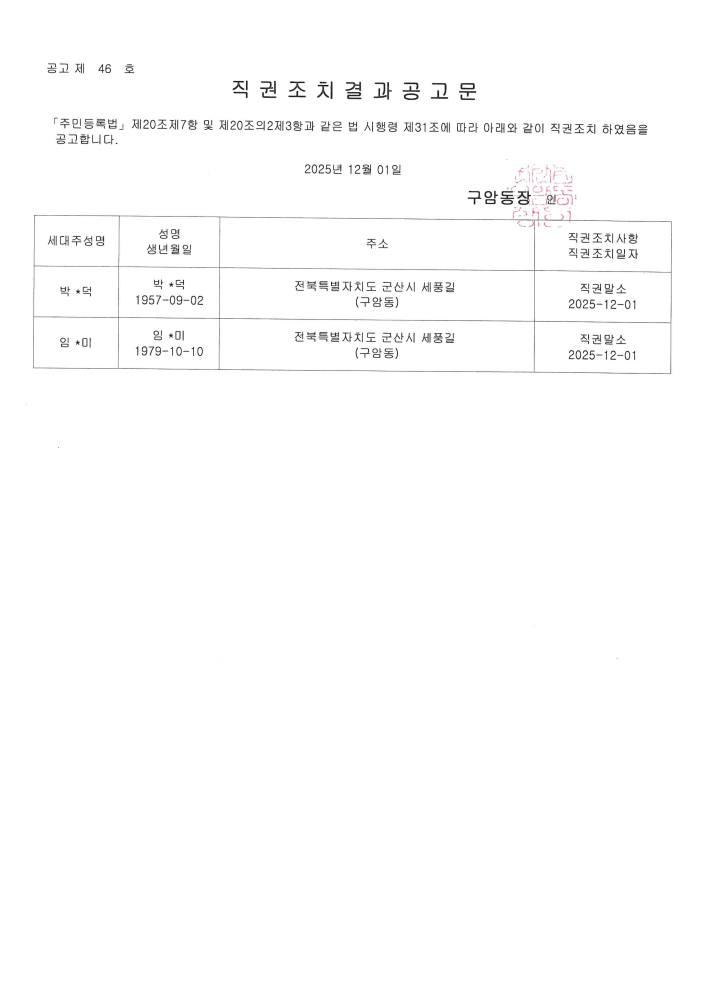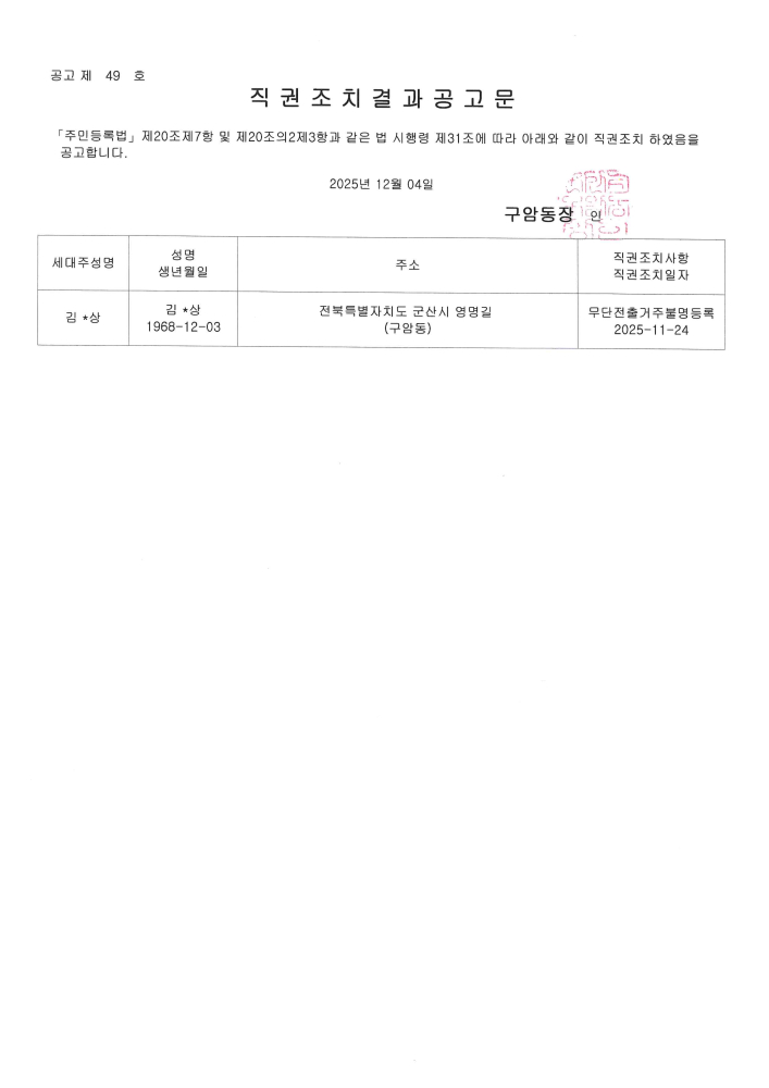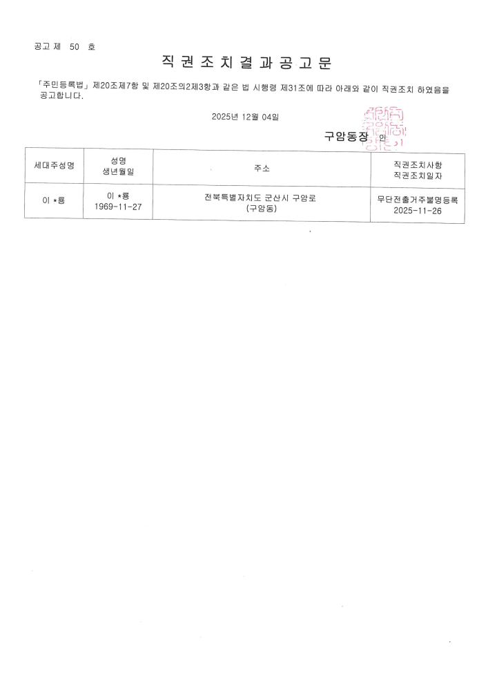 | 325 | 2025년 주민등록 사실조사에 따른 무단전출자 직권조치 결과 공고 |