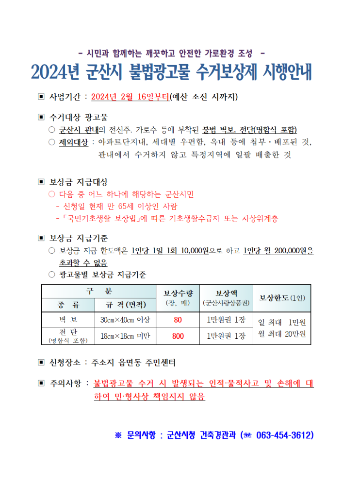| 116 | 2024년 군산시 불법광고물 수거보상제 시행 안내 |