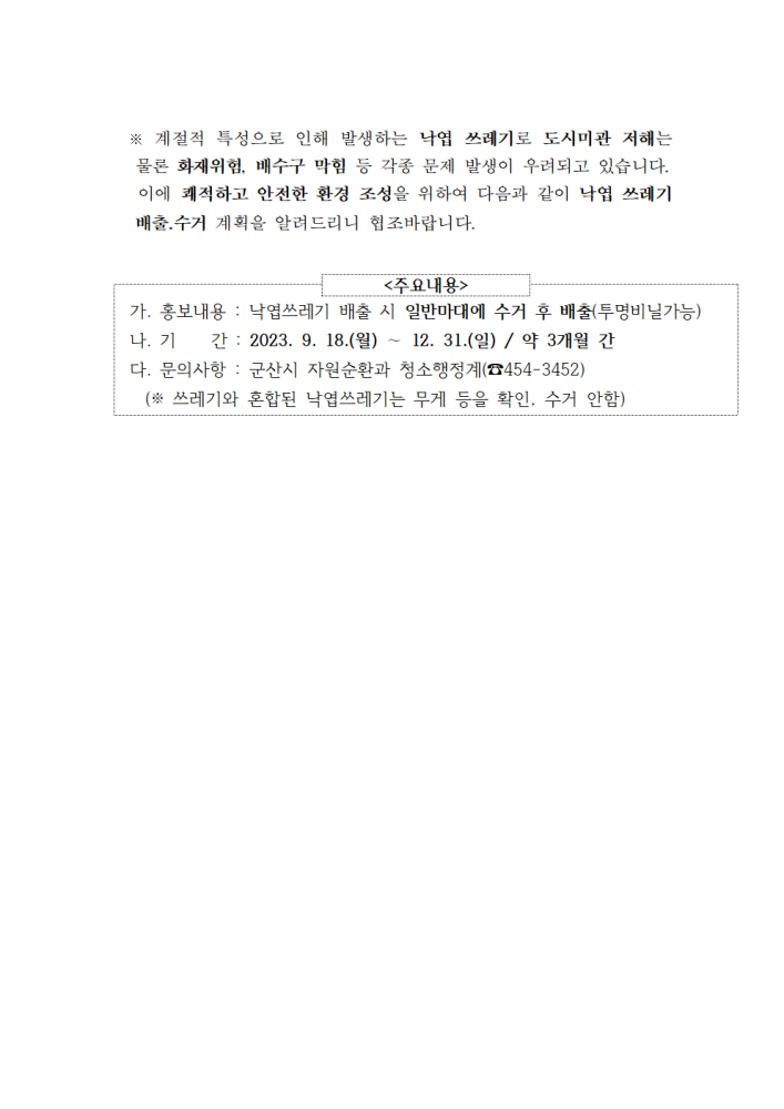 | 906 | 낙엽쓰레기 배출˙수거 계획 |