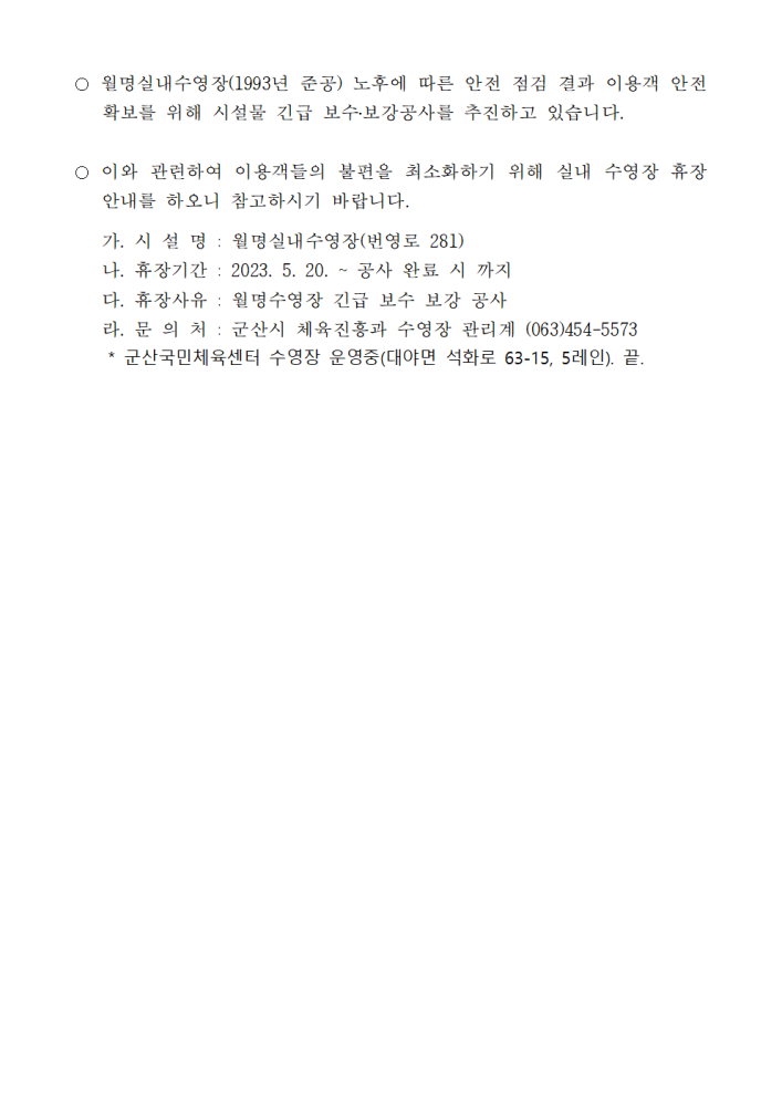 | 891 | 월명 실내 수영장 휴장 안내 |