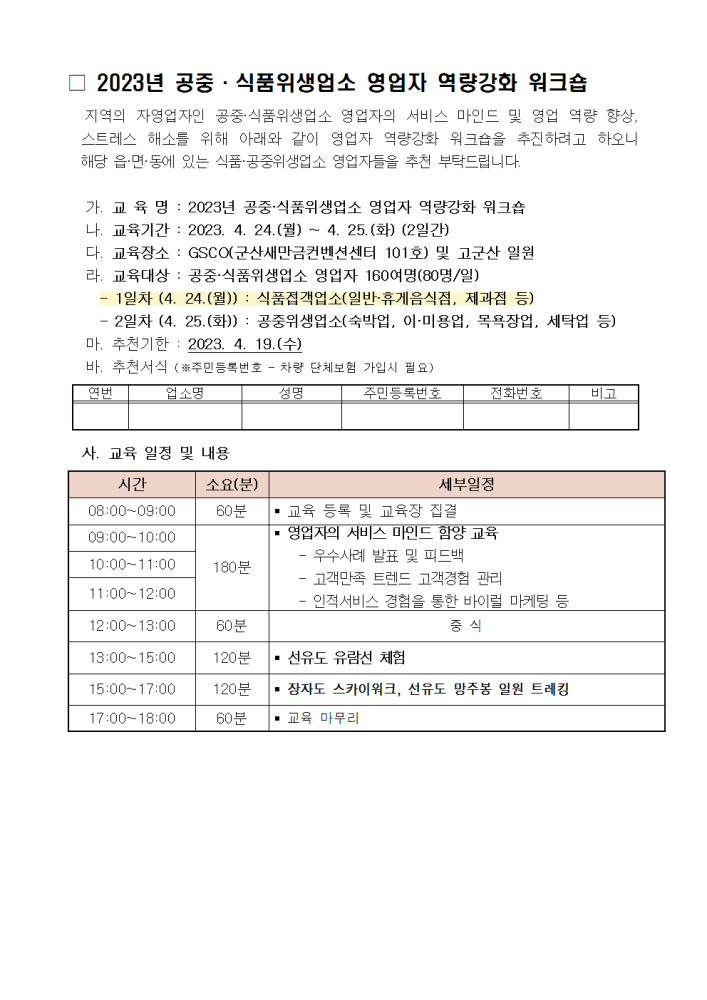 | 865 | 2023년 공중˙식품위생업소 영업자 역량강화 워크숍 |