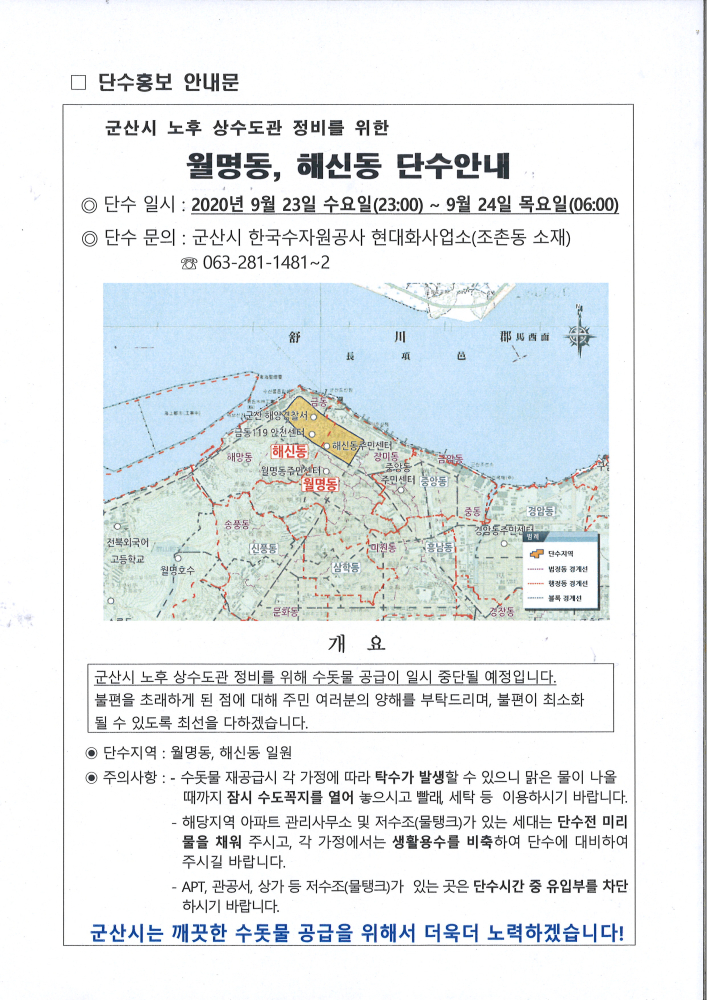 | 59 | 노후 상수도관 정비를 위한 해신동 단수안내 [9.23.(수)23시~9.24.(목)06시] |