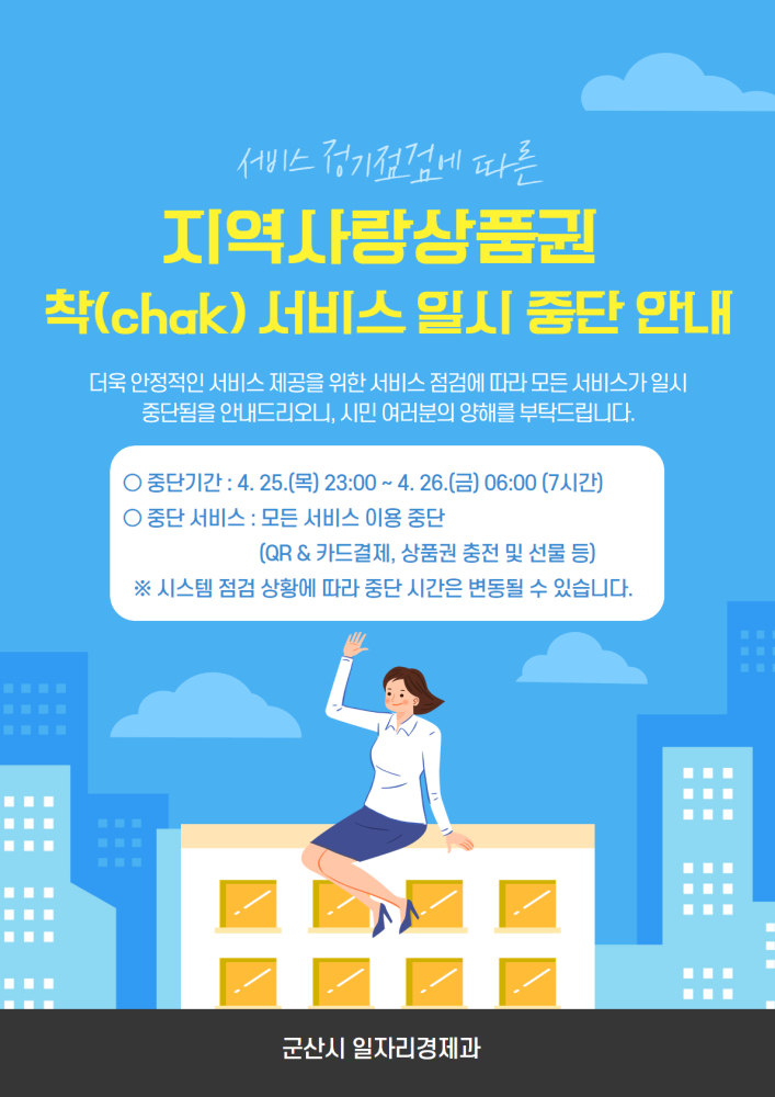 | 111 | 지역사랑상품권 착(chak) 서비스(4월25일 23시~4월26일 06시) 일시중단 안내 |