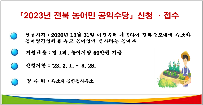 | 24 | 2023년 전북 농어민 공익수당 신청·접수 |