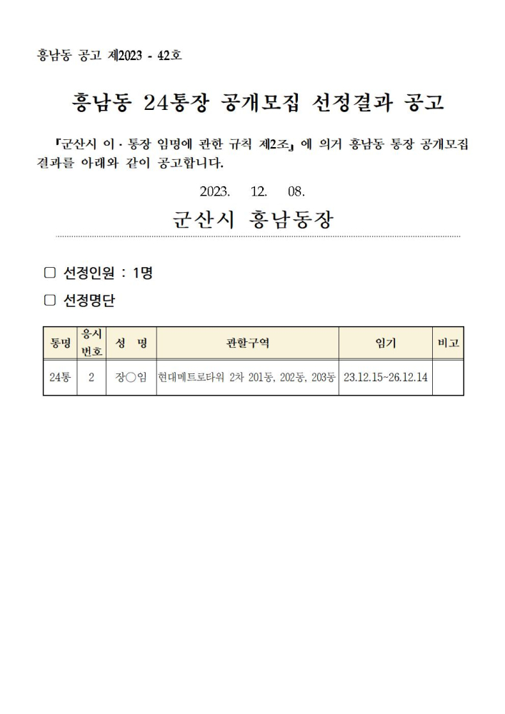 | 332 | 흥남동 24통장 공개모집 선정결과 공고 |