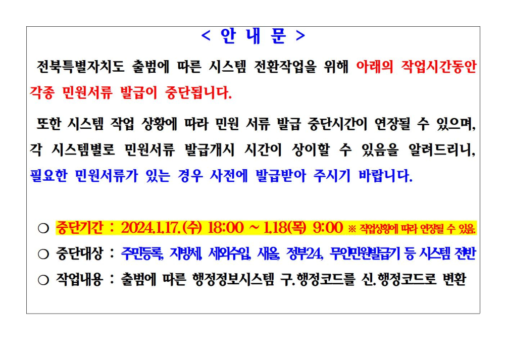 | 336 | 전북특별자치도 시스템 전환사업에 따른 주민등록시스템 등 중단 안내 |