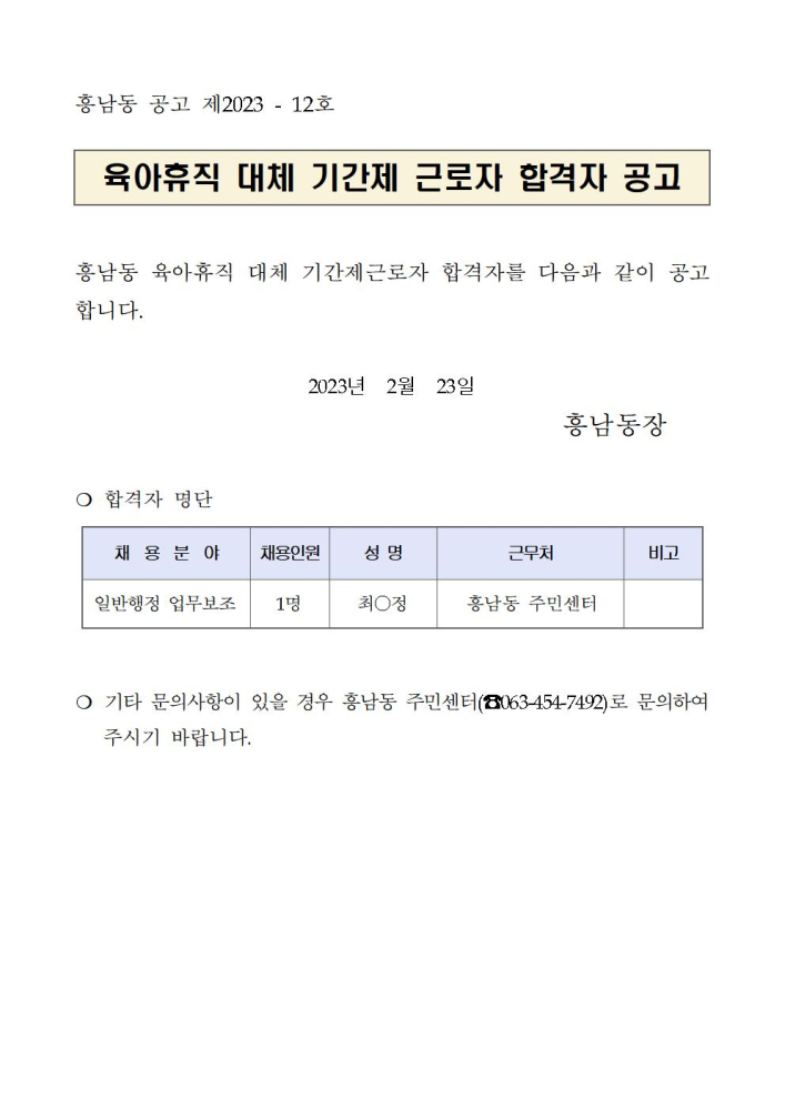 | 304 | 흥남동 기간제 근로자 채용 공고 |