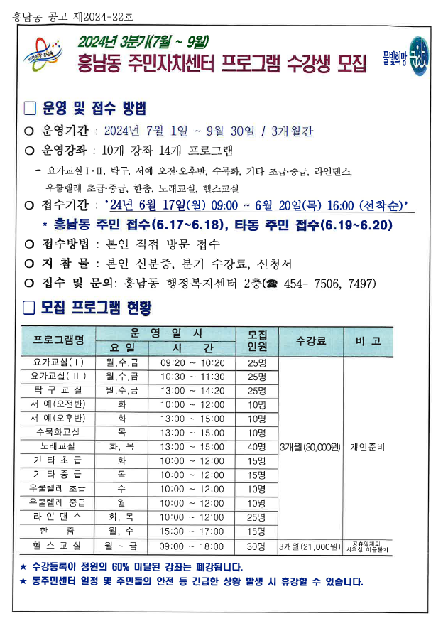 350 24년 3분기 흥남동 주민자치센터 프로그램 수강생 모집 공고 다운받기 흥남동 24.06.13 906