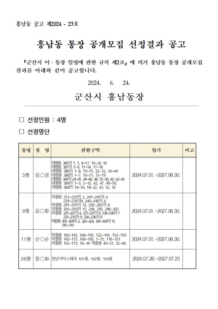 351 흥남동 통장 공개모집 선정결과 공고(3통, 9통, 11통, 26통) 다운받기 흥남동 24.06.24 751