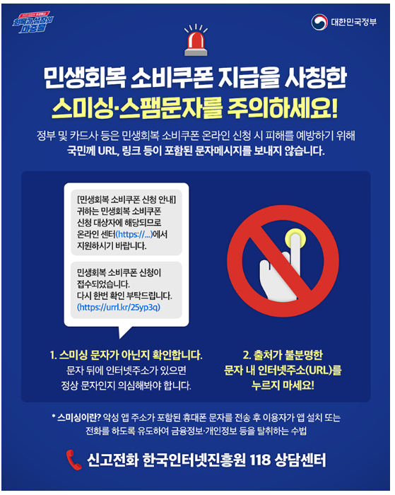 대국민 민생회복 소비쿠폰 지급 시기를 틈탄 스미싱,피싱 사이트, 보이스피싱 시도가