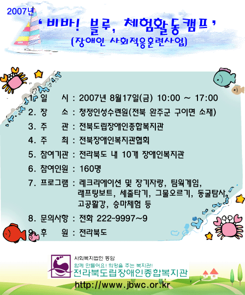 1. 프로그램 개요 가. 사 업 명 : '비바! 블루, 체험활동 캠프'(장애인 사회적응훈련사업) 나. 일 시 : 2007년 8월17일(금) 10:00 ~ 17:00 다. 장 소 : 청정인성수련원(전북 완주군 구이면 소재) 라. 주 관 : 전북도립장애인종합복지관 마. 주 최 : 전북장애인복지관협회 바. 참여기관 : 전북도립장애인종합복지관외 전라북도 내 9개 장애인복지관 사. 참여인원 : 160명 아. 후 원 : 전라북도