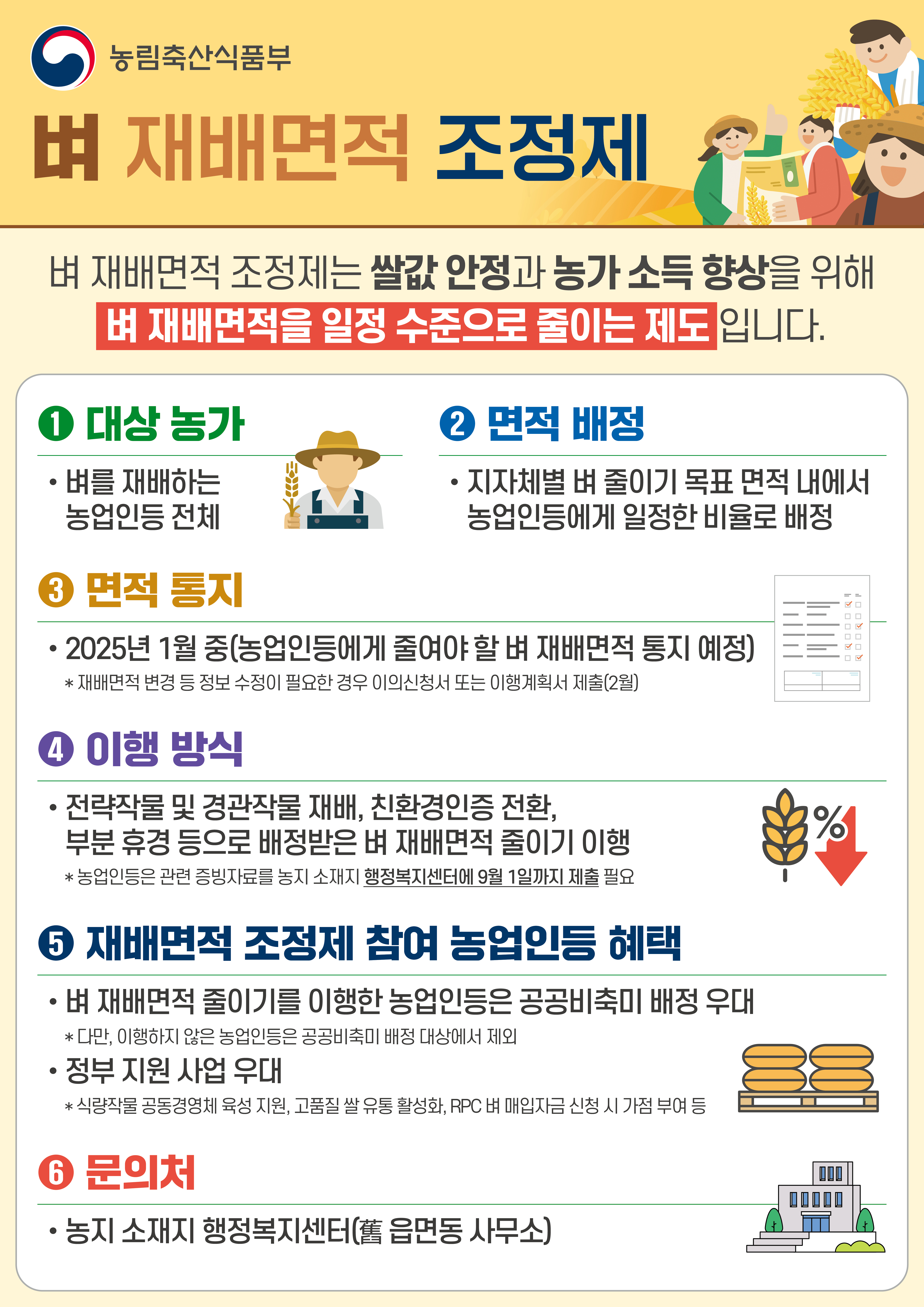 농림축산식품부에서는 쌀값 안정과 농가소득 향상을 위해 벼 재배면적을 일정수준으로 줄이는