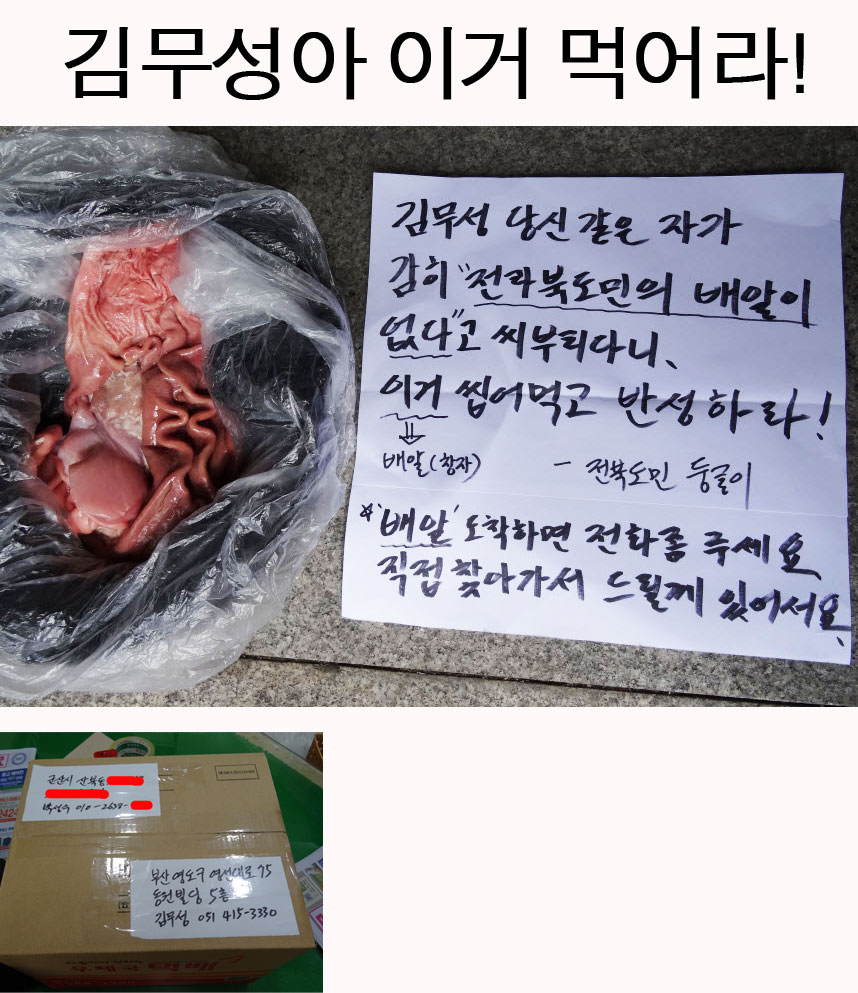 | 6748 | - 새누리 김무성한테 창자 한 봉지 사서 보냈습니다. 전북도민 참지 맙시다.- |
