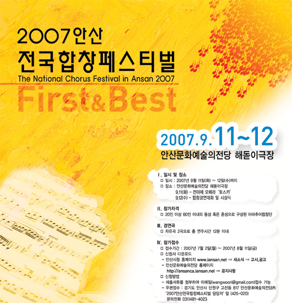 2007안산전국합창페스티벌이 화려한 막을 올립니다. ‘합창의 도시’,‘문화예술의도시’ 안산에서 한국합창의 발전을 도모하고, 아마추어 합창애호가들이 기량을 자유롭게 펼칠 수 있는 장이 될 전국합창페스티벌이 개최됩니다. 서울·경기권을 넘어, 지역간의 선의의 경쟁속에서 피어나는 우정을 합창의 아름다운