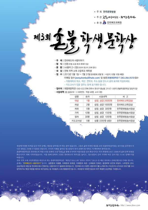 • 주제: ‘전라북도의 사랑이야기’ ― 성춘향과 이몽룡, 매창과 유희경, 매창과 허균, 신재효와 진채선, 동정부부 요안과 루갈다, 나무꾼과 선녀, 김삼의당과 하립 등 전라북도에서 전해지는 남녀의 사랑이야기를 주제로 함. ― 전라북도의 다양한 사랑이야기를 소개하거나 자신만의 시각으로 이야기를 다시 창작하거나 특정 부분을 떼어내 재구성하는 등 자유롭게 스토리텔링을 하면 됨. • 형식: 산문(수필·소설·희곡·취재기 등) • 분량: A4용지 3장(200자 원고지 20매 정도) • 대상: 전북 지역 소재 고등학교 재학생 • 일정: 5월 1일 - 7월 31일(결과발표 8월 말 / 시상식: 10월 10일) • 접수: 이메일 접수(jeonjuhonbul@nate.com) 및 방문(최명희문학관) 접수 ― 작품제목과 학교, 학년, 연락처, 주소 등을 반드시 글의 표지에 작성. ― 지도교사가 있을 경우는 함께 표기해야 함. • 시상내역 : 총 상금규모 1,100만원/ 학생 48명, 교사 5명
