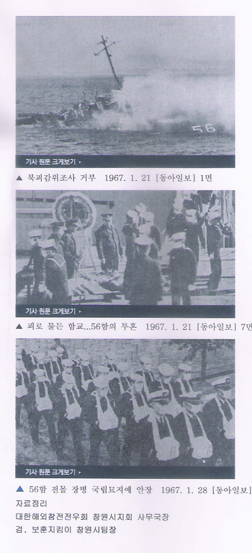 한낮이었다. 태양이 뻔히 내려다보고 있었다. 날은 구름 한 점 없이 맑았다. 바다엔 풍랑도 별로 없었다. 그 멀쩡한 시간, 대한민국 해군 56함은 시커먼 연기를 내뿜으며 바다로 침몰하고 있었다. 강원도 금강산이 보이는 어로저지선 인근 해상이었다. 1967년 1월19일, 정확히 오후 2시34분이었다.