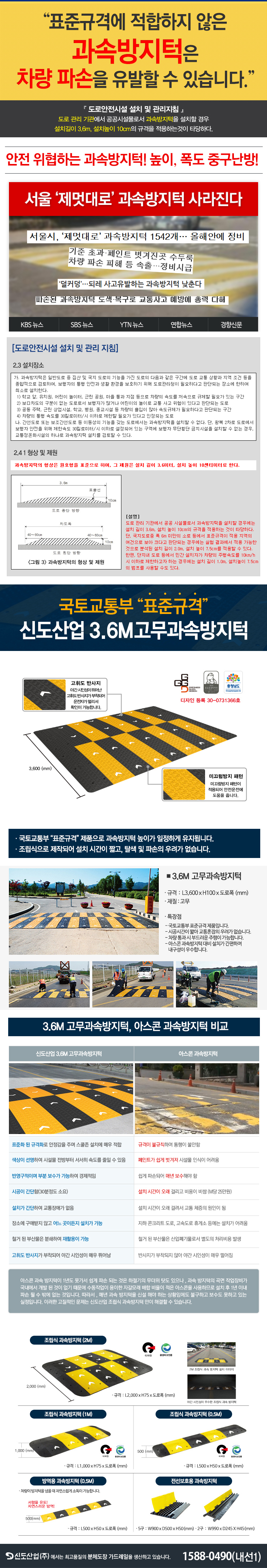 국내 도로내 사고 방지 및 운전자의 안전을 위해서 표준규격의 과속방지턱이 설치 되어야 합니다. 신도산업 [3.6m 과속방지턱]은 국토교통부 표준규격에 적합하며 조립식 제품으로 시공 시간이 매우 짧고, 튼튼한 고무재질로 제작되어 무거운 하중에도 파손되지 않으며,황색과 흑색으로 구성되어 시인성이 우수, 탈색의 염려가 없고 과속방지턱의 높이가 일정하게 유지 되는 차별화 된 제품입니다.