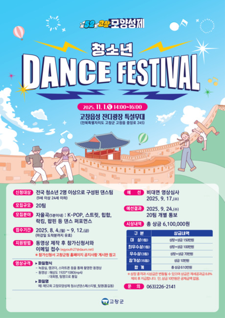 2025년 11월 1일 제52회 고창 모양성제 청소년 댄스 페스티벌이 야외 특설무대에서 드디어 막을 올립니다.