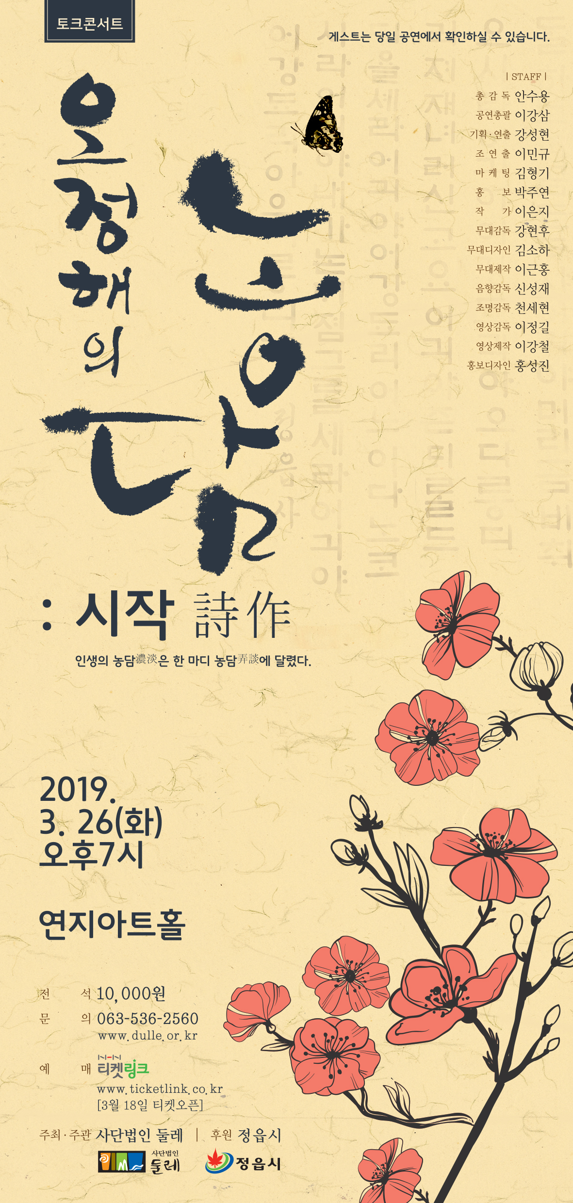 ‘농담’은 사전적으로 ‘실없이 놀리거나 장난으로 는 말(弄談)’, ‘농업에 관한 이야기(農談)’, 색깔이나 명암 따위의 짙음과 옅음, 용액 따위의 진함과 묽음 또는 그런 정도(濃淡)의 의미를 담고 있습니다. 이 처럼 중의적이며 다양한 뜻을 담고 있는 ‘농담’처럼, 토크 콘서트 오정해의 농담은 관객 여러분과 함께 할 수 있는 다양한 주제로 공감과 감동을 선사하고자 합니다. 매월 마지막 주 화요일에 찾아오는 토크 콘서트 오정해의 농담, 그 첫 ‘시작(始作)’을 오는 3월 26일 화요일 ‘시작(詩作)’ 으로 찾아갑니다!