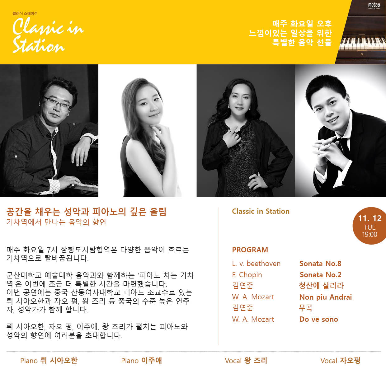 이번 공연을 특별히 중국의 연주자, 성악가 분들을 모시고 진행합니다. 중국 산동여자대학교 피아노 조교수로 있는 뤼 시아오한과 자오 펑, 왕 즈리 등 중국의 아티스트들과 이주애 피아니스트로 이번 공연이 꾸려집니다. 중국의 수준 높은 아티스트와 함께하는 피아노 치는 기차역많은 관람 부탁드립니다.