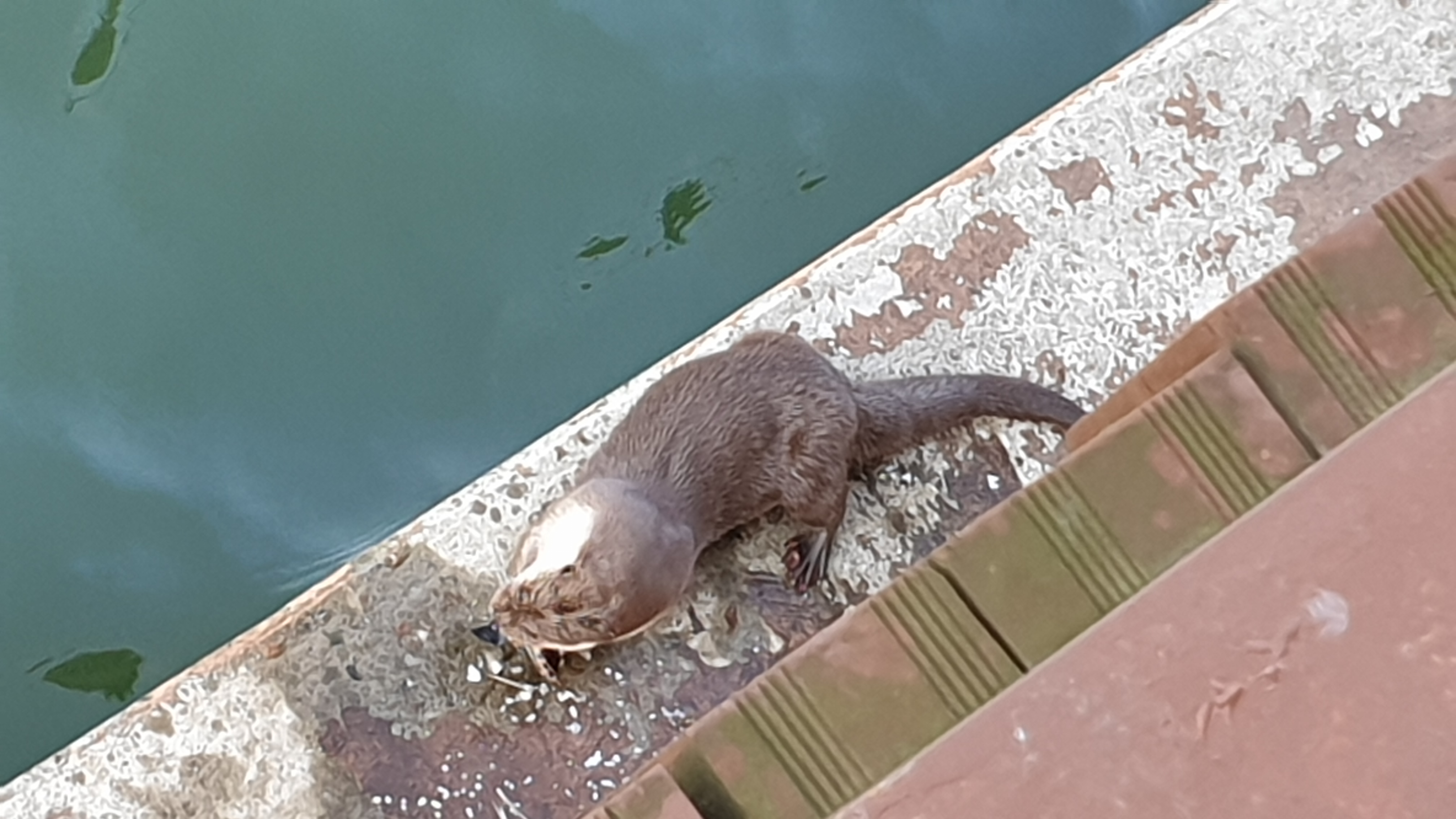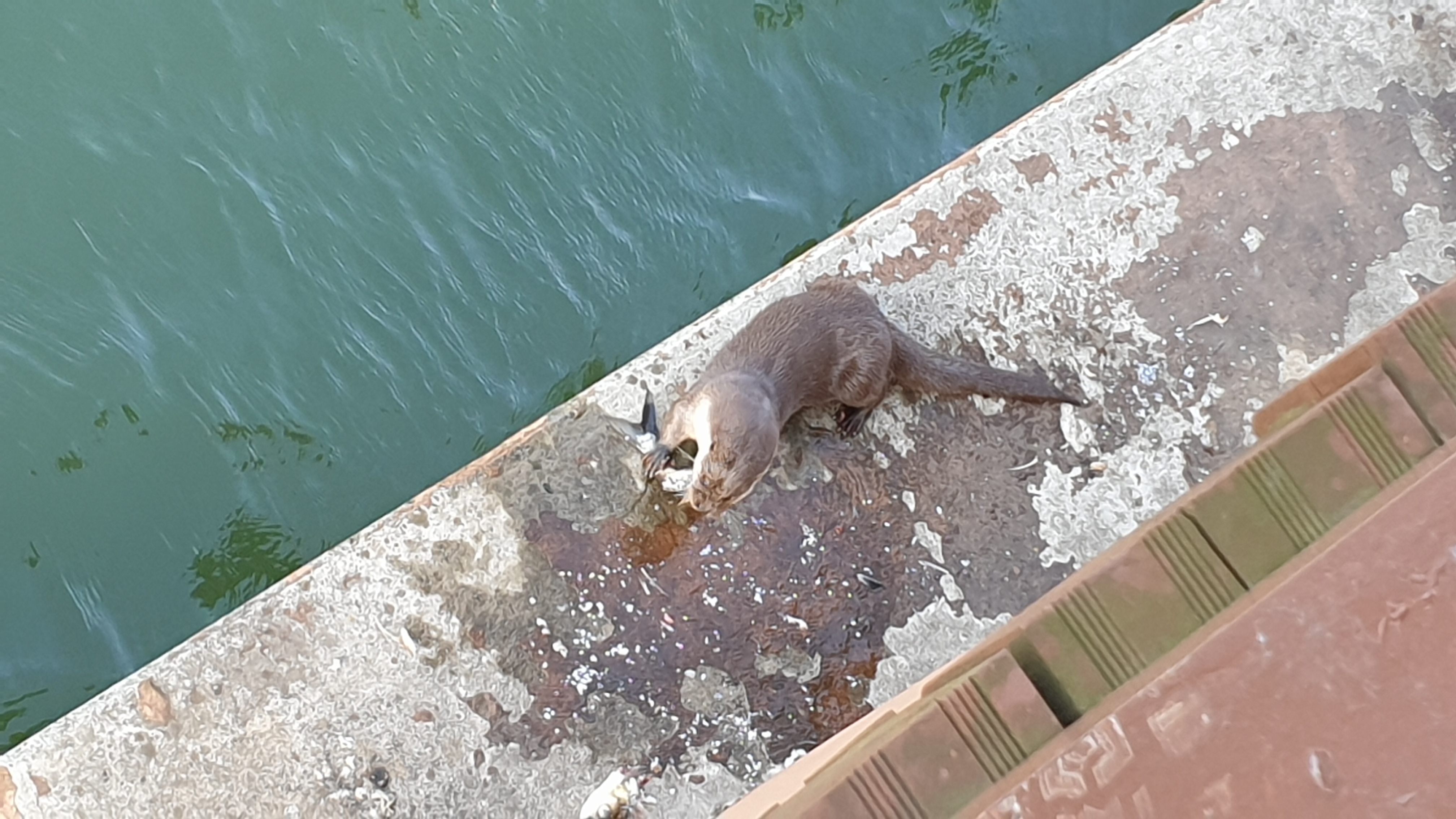 오늘 오후에 은파 물빛다리 교각에서 귀여운 수달이 큰 물고기를 잡아 맛있게 식사하는 것을 봤습니다.
