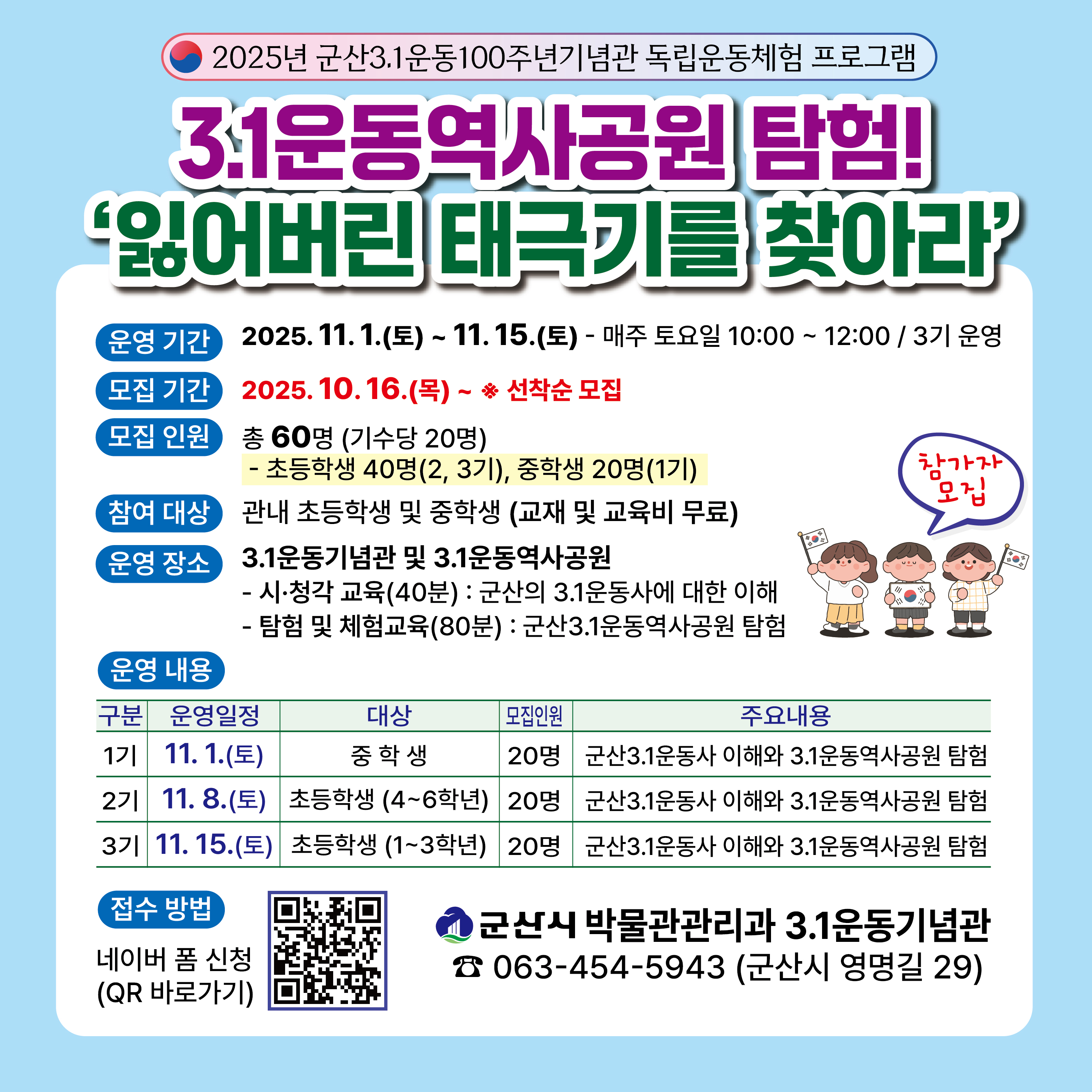 ▶ 문 의 : 군산시 박물관관리과 3.1운동기념관 ☎(063- 454- 5943)