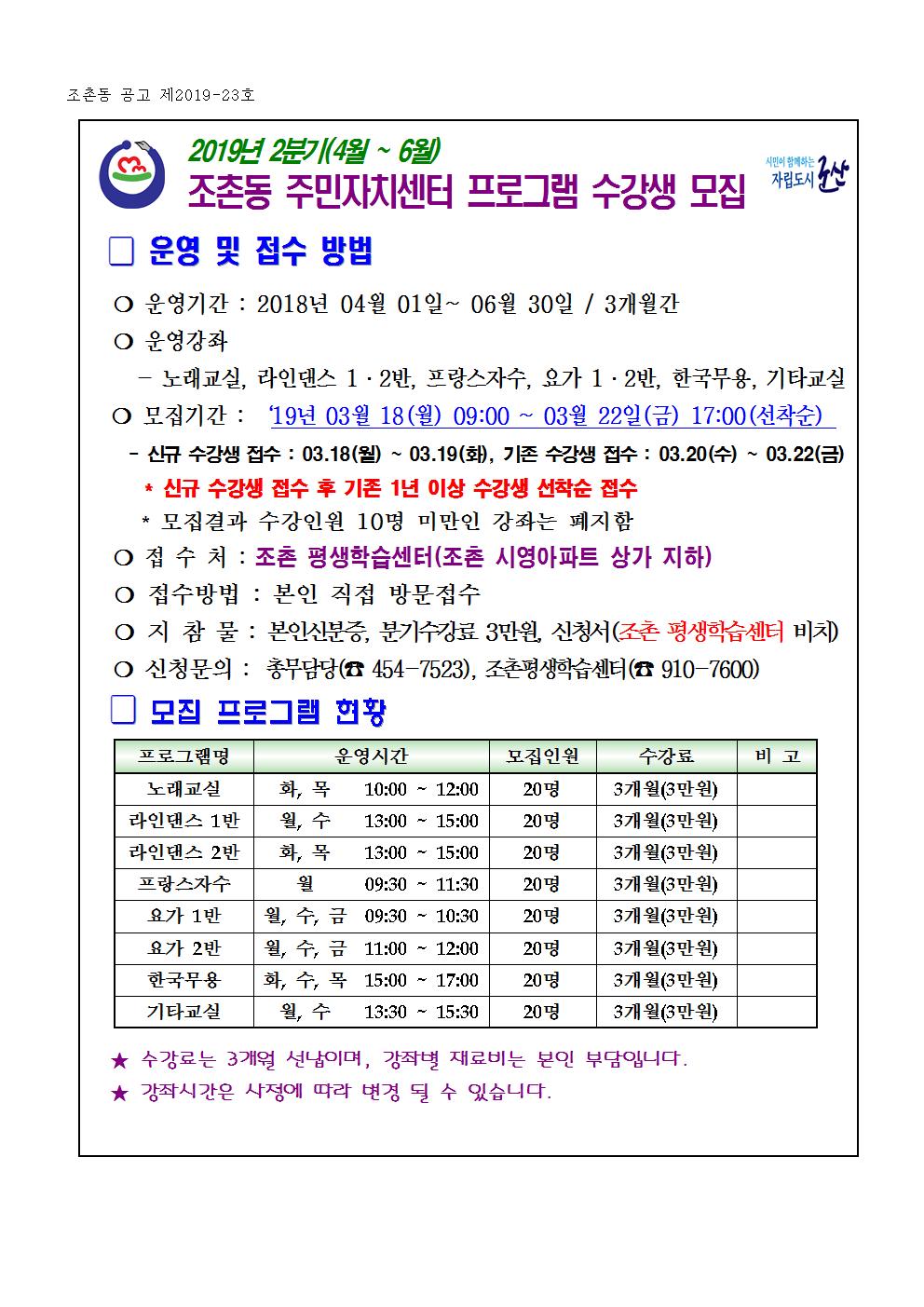 | 4 | 2019년 2분기 조촌평생학습센터 주민자치프로그램 수강생 모집 |