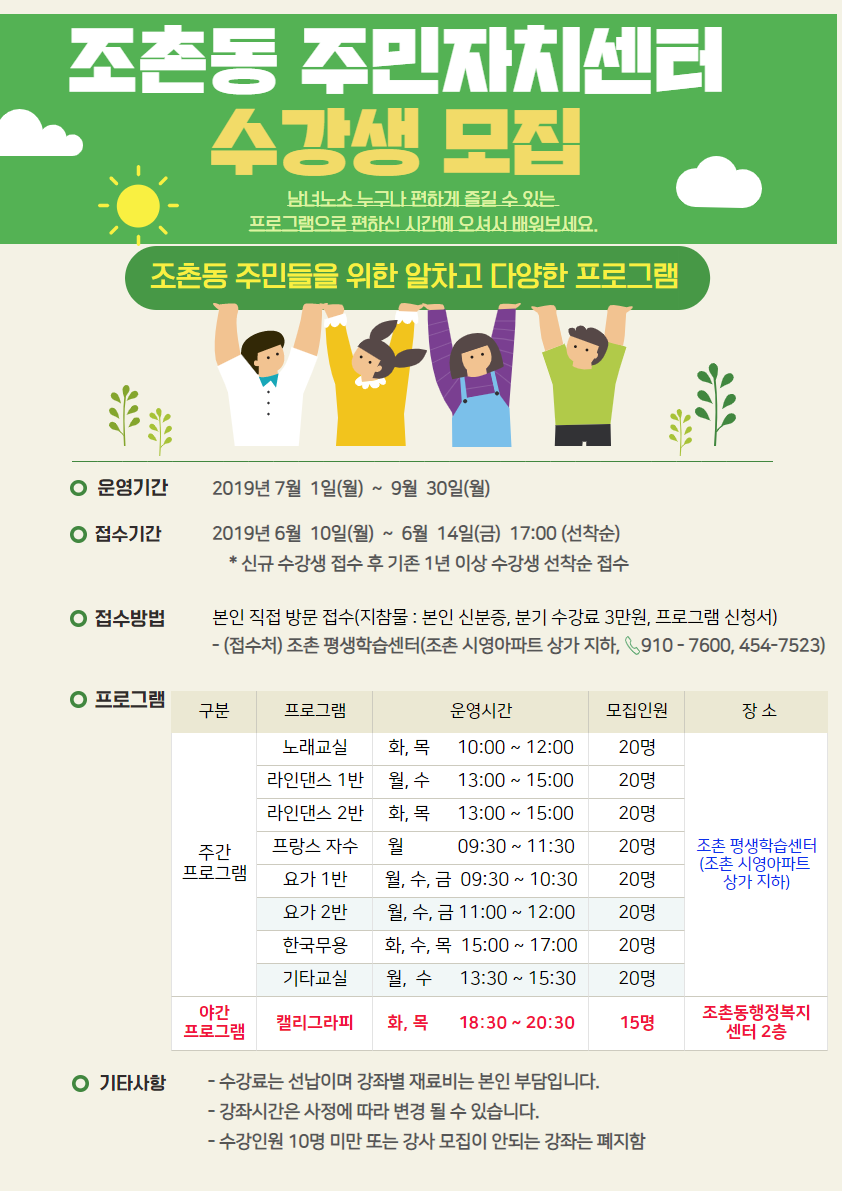 2019년 3분기 조촌동 주민자치프로그램 야간강사 및 수강생을 아래와 같이 모집하고자 합니다.
