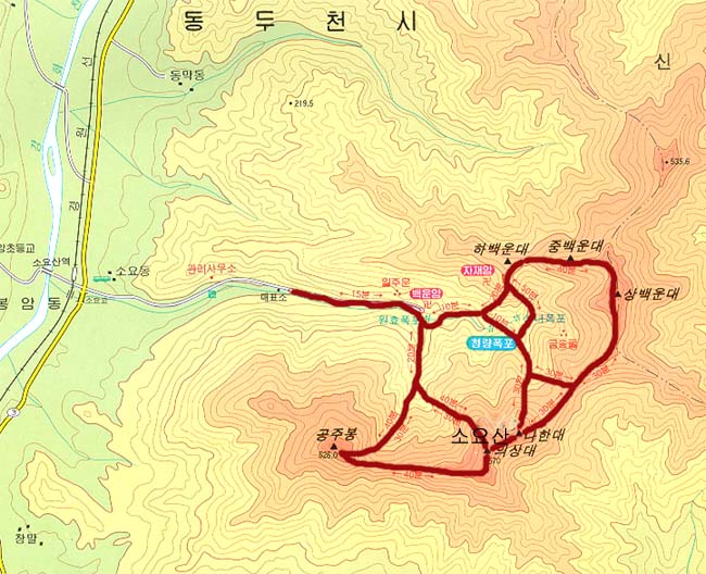 소요산은 주차장에서 일주문을 지나 협곡의 자재암을 가운데 두고 하백운대에서 공주봉까지 6개의 봉우리가 말발굽 모양으로 능선으로 펼쳐져 있는데 이 여섯봉우리(하백운대, 중백운대, 상백운대, 나한대, 의상대, 공주봉)를 능선을 타고 산행하는 것이 일반적인 코스다. 산행시간은 4시간이 소요된다.