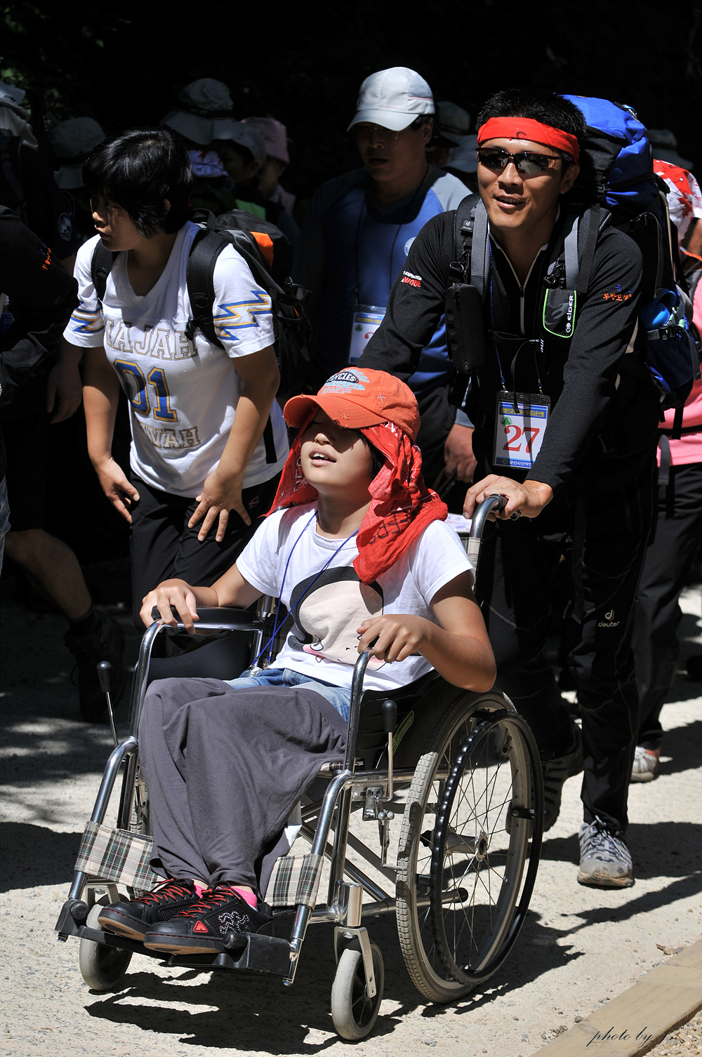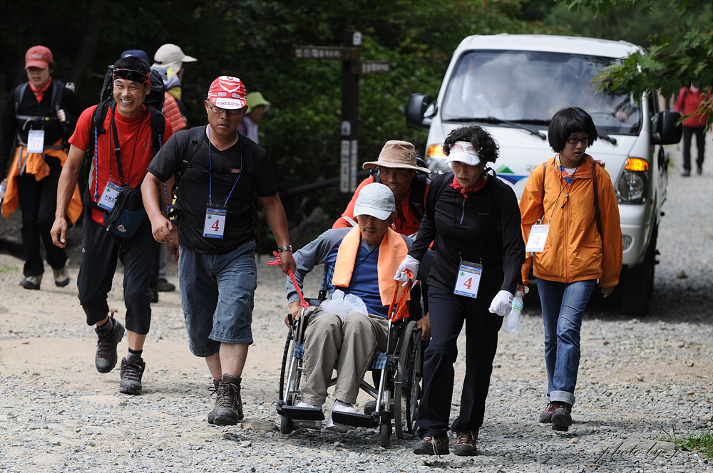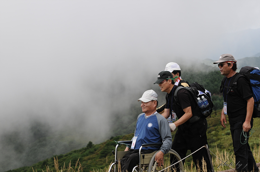 지난 8월31일(일요일) 군산시산악연맹(회장 김 성수)는 장애인50여명과 그 가족들. 그리고 250명의 군산시산악연맹산하 30여개 산악회 회원 및 자원봉사자들이 함께 어우러져 성삼재에서 노고단까지 합동산행을 실시 했습니다. 8월의 뙤약볕 아래에서 땀흘리며 휠체어를 뒤에서 밀고 앞에서 당기며 불편한 그들의 손과발,귀와 입이되어 잠시의 외출도 부자연 스러워 꺼리게 되는 장애인들에게 산악인들의 놀이마당인 산을 함께 느끼고 그들에게 사회에 당당하게 서서 할수있다는 자신감을 진작시키기 위함에 부족함이 없었다고 보여 집니다. 두시간 넘게 땀흘리며 선 노고단 정상에서 반야봉을 감싸고 돌아가는 운무만큼이나 깊은 감동을 서로가 공유했으며 그보다 더 큰 행복감은 사랑을 나누었다는데 있다고 여겨 집니다. 그렇게 네시간여의 아름다운 산행을 했으며 헤어질때는 서로가 헤어지는것이 아쉬워 마음속으로 내년을 기약하며 산행을 마무리 했습니다.