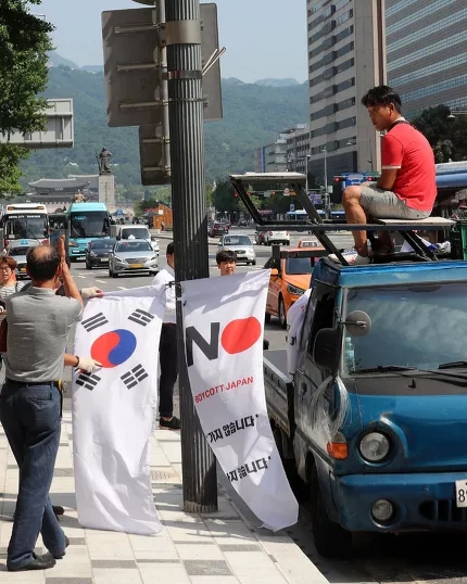 세종대로에 걸린 태극기와 '노 재팬' 깃발