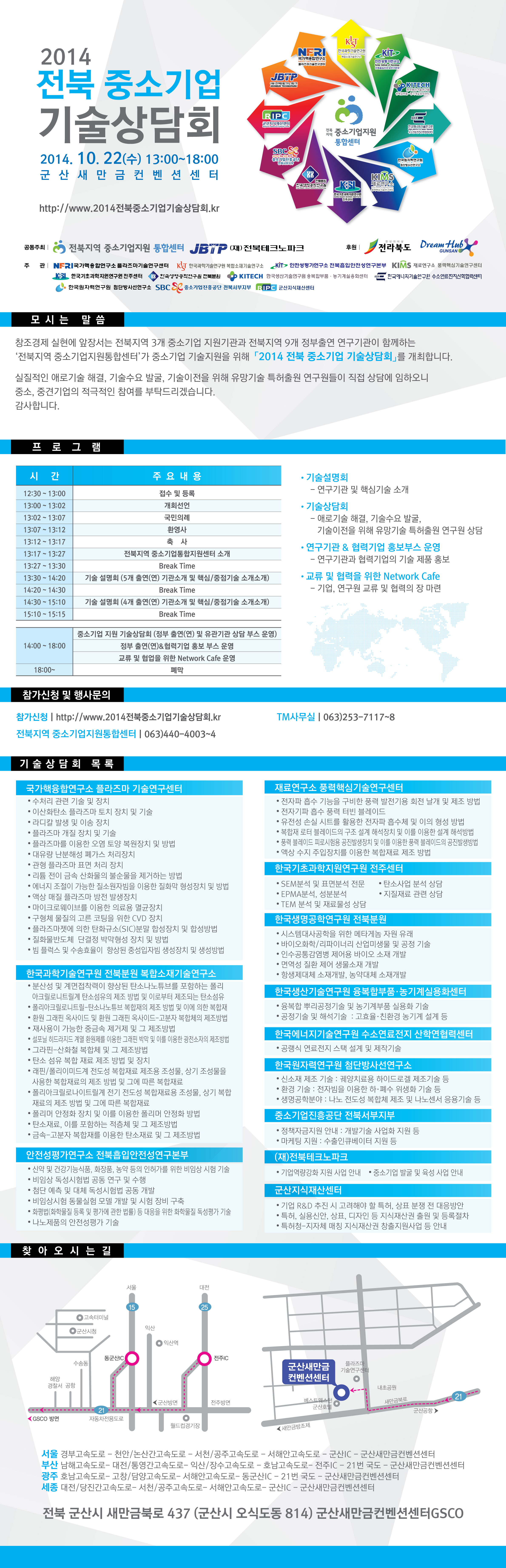 ○ 전북중소기업지원통합센터가 주최하고 군산시가 후원하는 ‘2014 전북중소기업 기술상담회’가 10. 22(수) 13:00 군산 새만금컨벤션센터에서 개최됩니다.