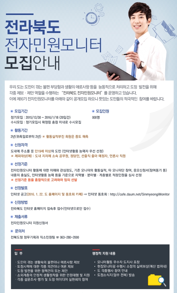 2. 위호와 관련 도정에 관심이 많은 도민을 대상으로 인터넷 공모를 통하여 제10기 전자민원모니터를 붙임과 같이 모집합니다.