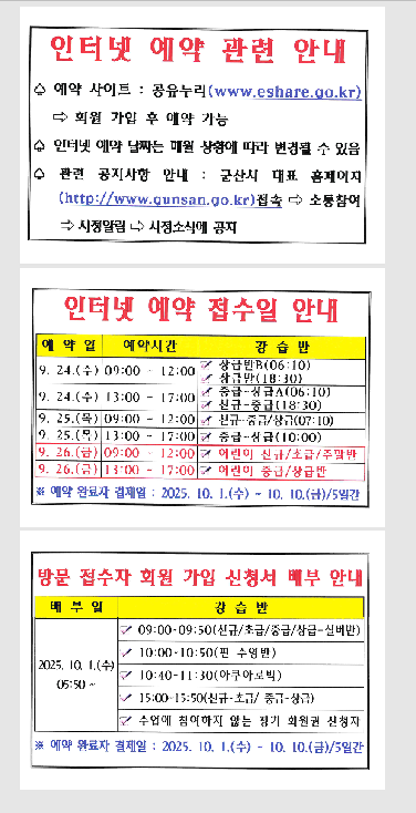 2. 인터넷 예약 접수일 : (성인반) - 2025. 9. 24.(수) ~ 9. 25.(목) / (어린이반)-2025. 9. 26.(금)*첨부 파일 참조