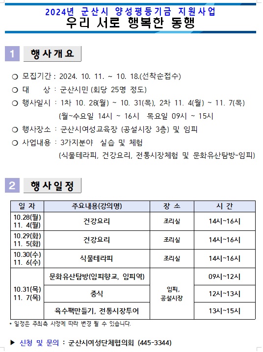 | 364 | 우리 서로 행복한 동행(2024년 군산시 양성평등기금 지원사업) 모집 안내 |