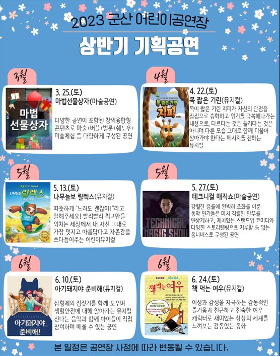 2023년 상반기 어린이공연장 기획공연 일정을 아래와 같이 안내합니다.