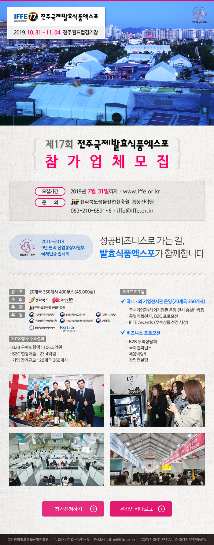 올해 17회를 맞는 전주국제발효식품엑스포(IFFE 2019)가 다음과 같이 개최되오니 관내 발효식품 제조업체 및 시민여러분의 많은 관심과 참여바랍니다.