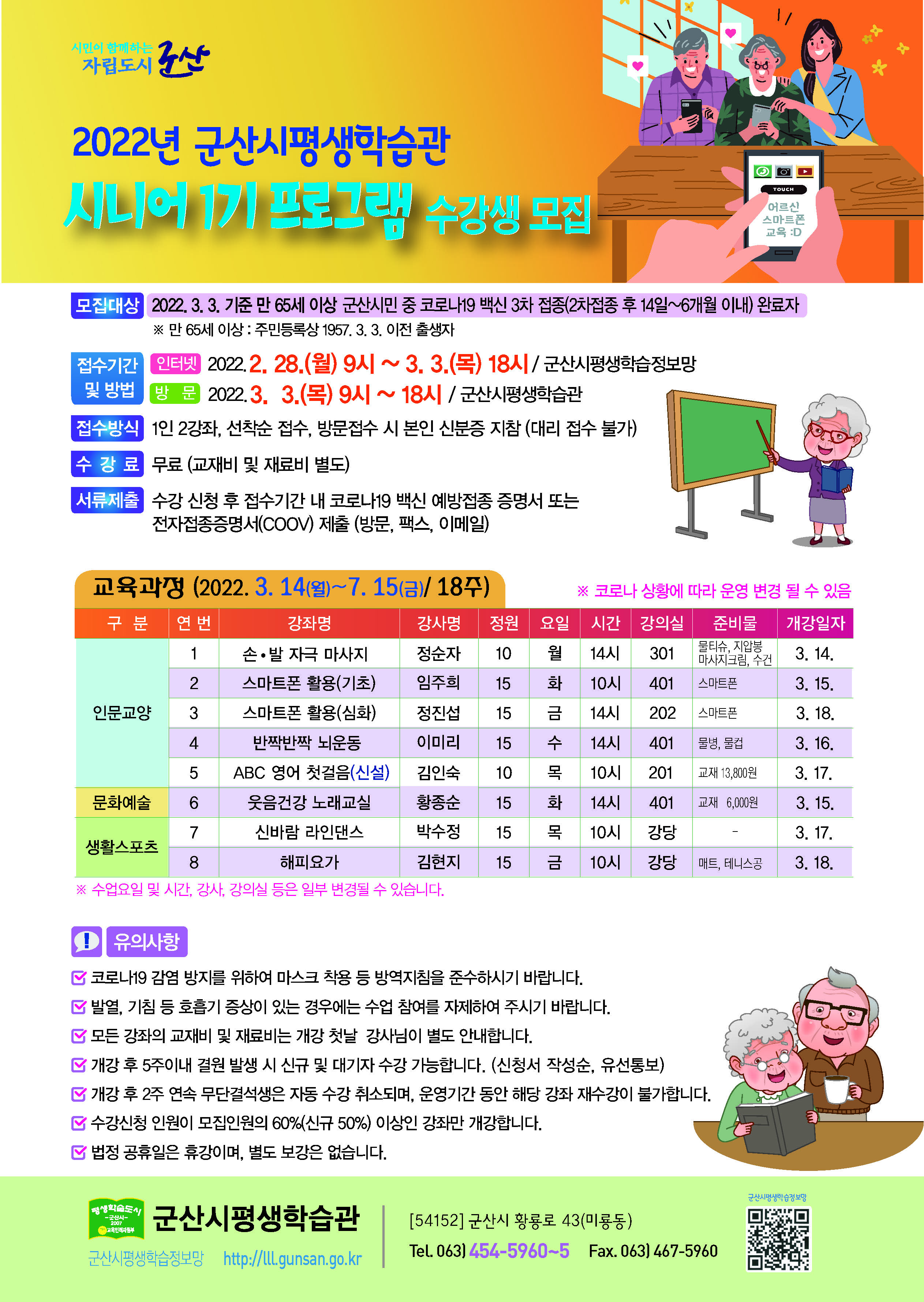 - 온라인 접수(4일간) : 2022. 2. 28. ~ 3. 3 / 군산시평생학습정보망