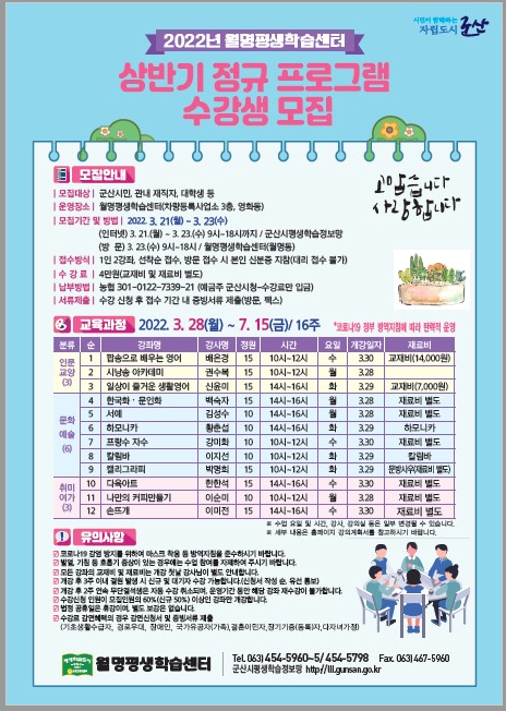 -인터넷 : 군산시평생학습정보망 로그인(회원가입)→평생학습관→월명평생학습센터→신청하기→수강생 정보 입력