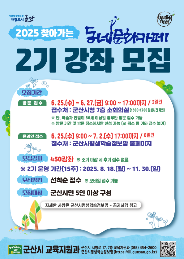 (온라인 접수) 6. 25.(수) 9:00 ~ 7. 2.(수) 17:00까지 / 군산시평생학습정보망 홈페이지