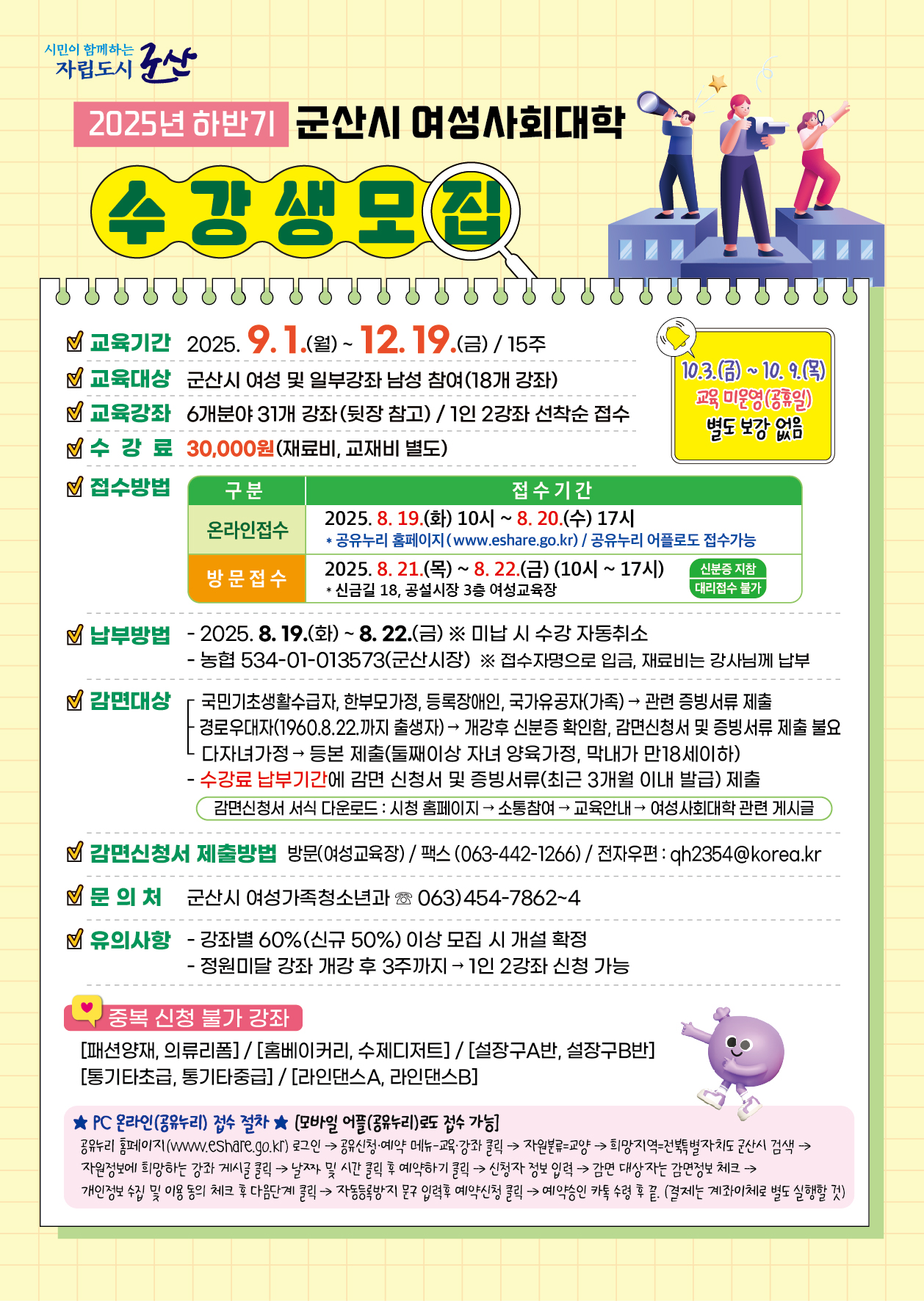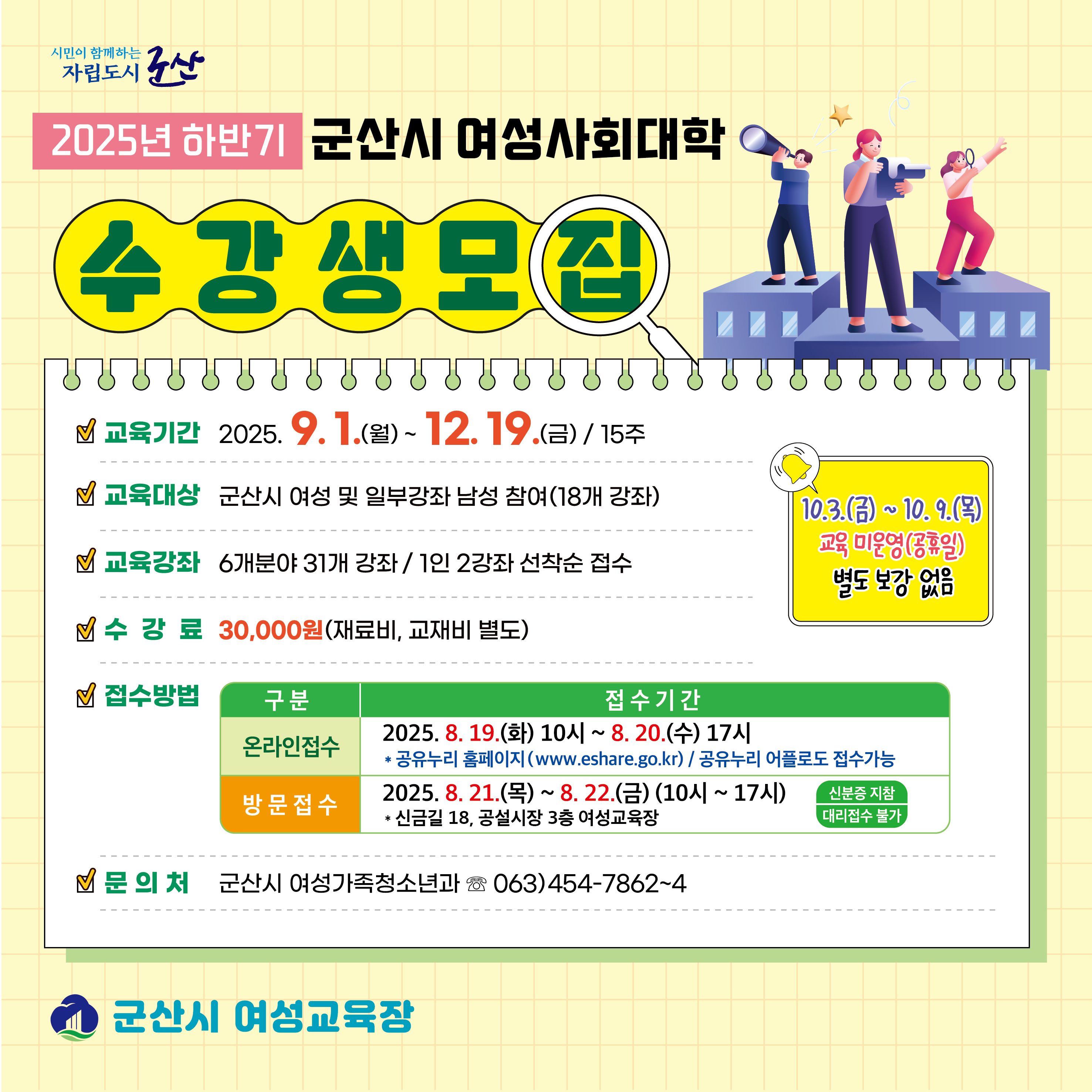 2. 모집대상 : 군산시 여성 및 일부강좌 남성 참여